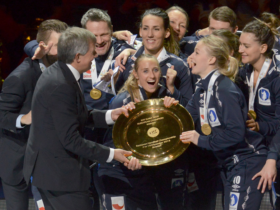 EHFs Michael Wiederer overrekker EM-trofeet til Norge. Kaptein Stine Oftedal Bredal (t.h.) og jentene kan for alvor slippe jubelen løs. Foto: Terje Anthonsen.
