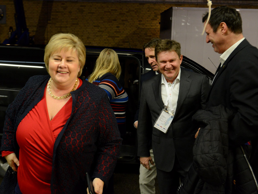 Både statsminister Erna Solberg, Idrettspresident Tom Tvedt (t.h.) og Håndballpresident Kåre Geir Lio (i midten) fikk oppleve håndballfesten i Scandinavium. Helt bak på bildet Generalsekretær Erik Langerud i Norges Håndballforbund. Foto: Terje Anthonsen.