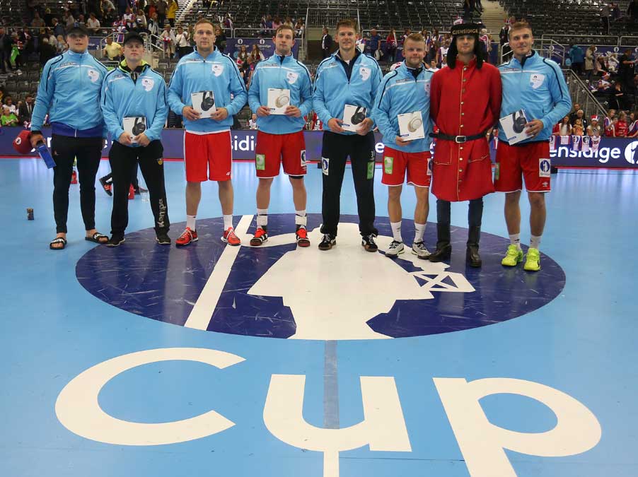 Islands kaptein Olafur Gudmundsson fikk 3. plass-pokalen av Janneke T. Hjort i Gjensidige.
