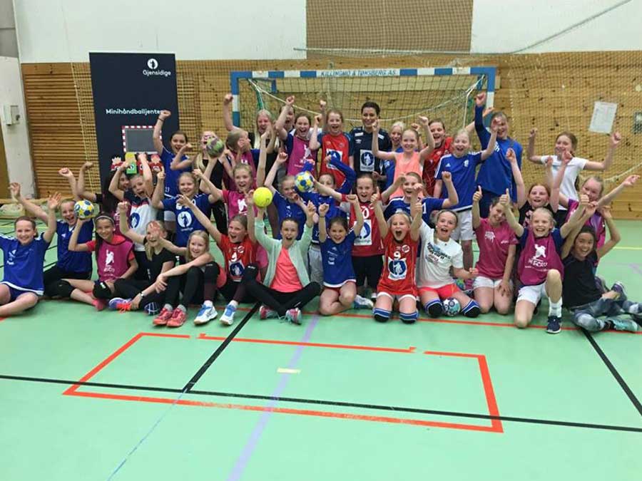 Stor jubel for Nora Mørk og hennes besøk hos Minihåndballjenta Kaja Tomasine Selboskar og hennes Korsvoll-medspillere.