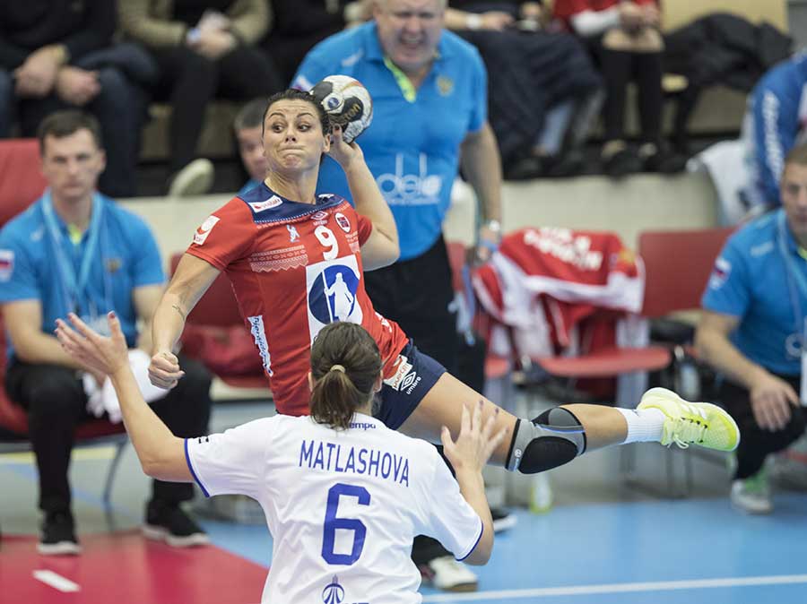 Katrine Lunde startet kampen med en redning og Norge gikk opp i 3-0, men russerne kom raskt likt igjen var plutselig foran 7-6, men Norge snudde og ledet 9-7.