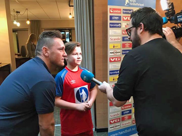 Joakim og maskott Magnus blir intervjuet av NRK.