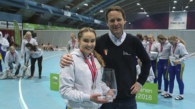 NHFs generalsekretær Erik Langerud delte ut pokalen til Melhus. Foto: Svein André Svendsen/NHF