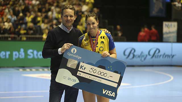 Erik Langerud fra NHF overrekkere 2. premien til Storhamars Betina Riegelhuth. Foto: Svein André Svendsen/NHF