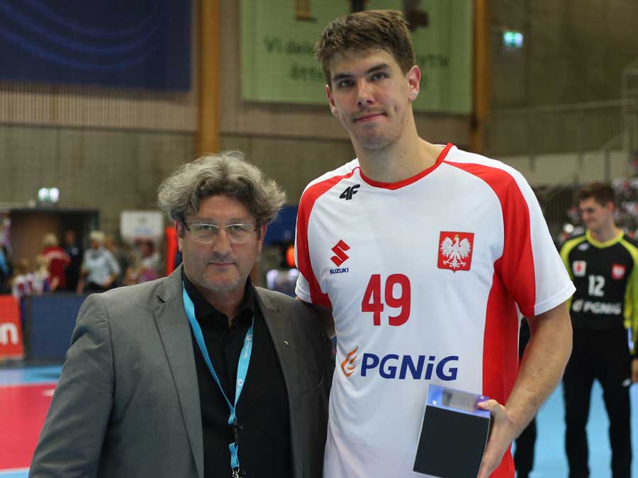 Polens Piotr Chrapkowski fikk bestemannspremie i første kamp mot Sverige. Utdeler Ivar Karlstad, daglig leder NHF Region Innlandet.