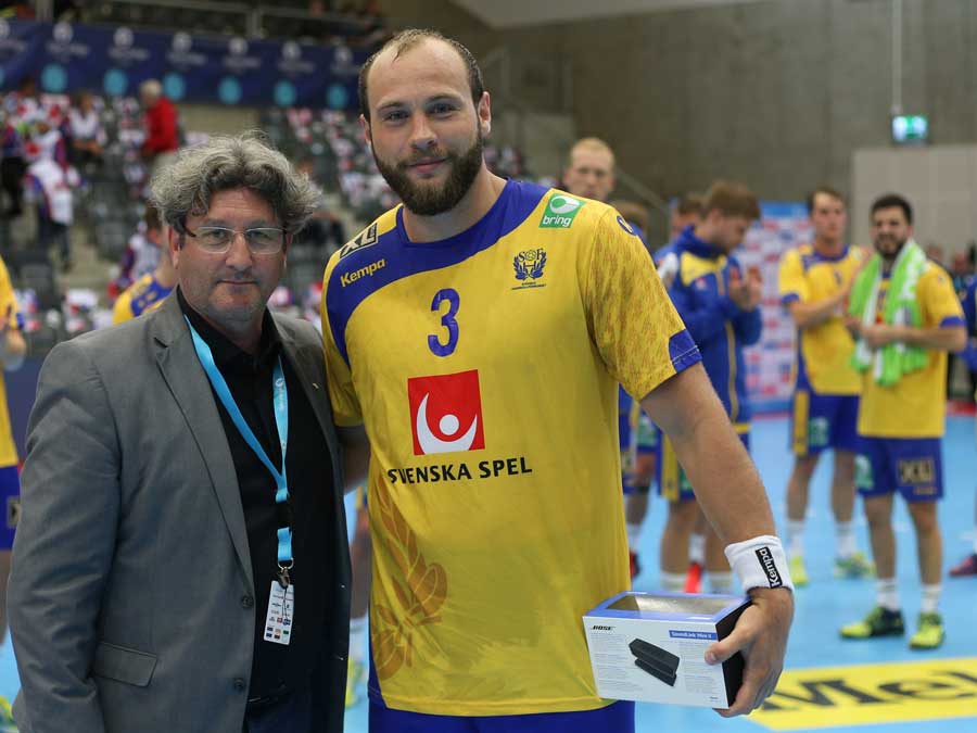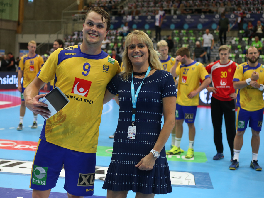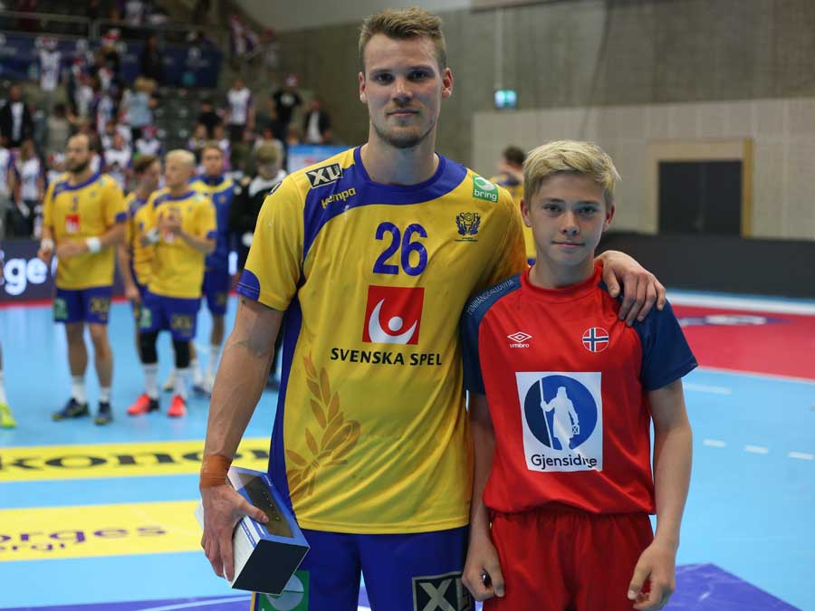 Markus Olsson, Sverige fikk sin bestemannspris av Minihåndballgutt Fredrik Venemyr. Foto: Svein André Svendsen/NHF