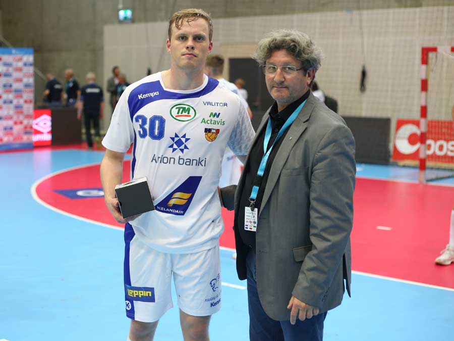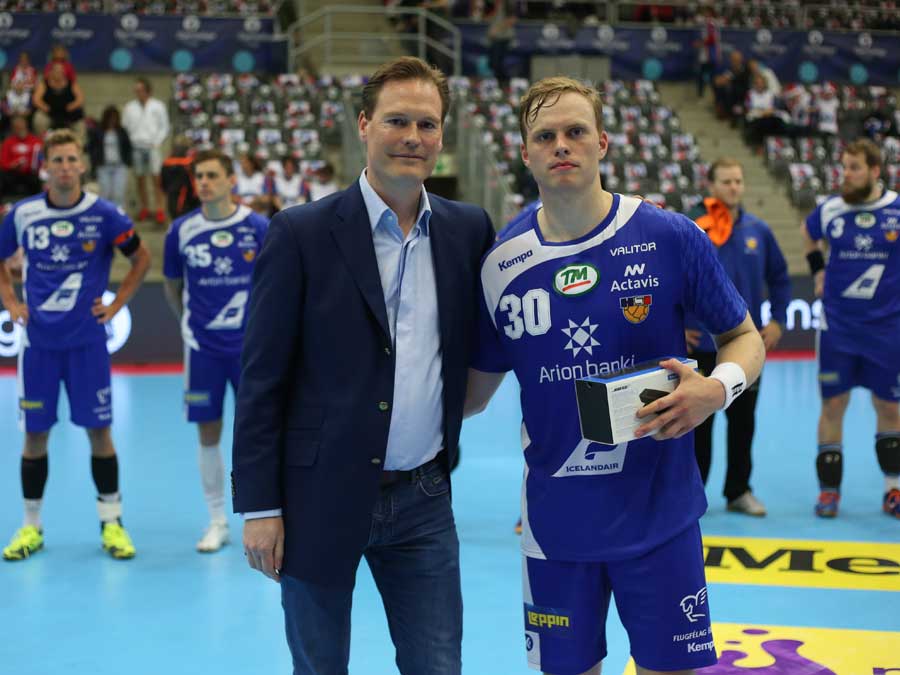 Omar Ingi Magnusson fikk bestemannspremie hos Island i lagets siste kamp. Her sammen med Krister Aanonsen, Konserndirektør privat hos Gjensidige.