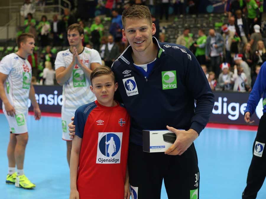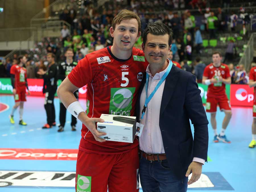 Sander Sagosen best på Norges lag mot Island. Her med sponsorjef Stian Grøstad i Gjensidige. Foto: Svein André Svendsen/NHF