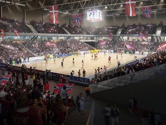 To EM-sluttpill i håndball i 2020 - både for damer og herrer - og med det norske laget i begge mesterskapene, da kan det bli seende omtrent slik ut - med 8000 på tribunen. (Illustrasjon: LINK SIGNATUR)