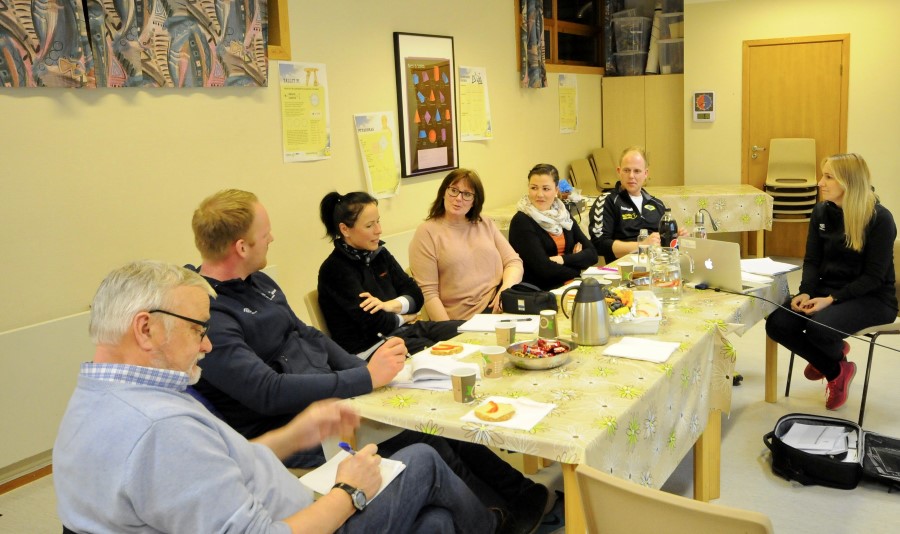 Klubbrådgiver Tonje Tangvik (foran t.v.) på klubb-besøk til håndball-leder Daniel Næss (foran t.h) og hans styrekolleger - bak f.v.: sportslig leder Hilde Nordtømme, nestleder Grete Skjærvold og sekretær Mona Engan. Bakerst soneleder Magnar Klingenberg (t.v.) og klubbrådgiver Ola Tømmerås. (FOTOS: Tore Sæther / NHF Region Nord)