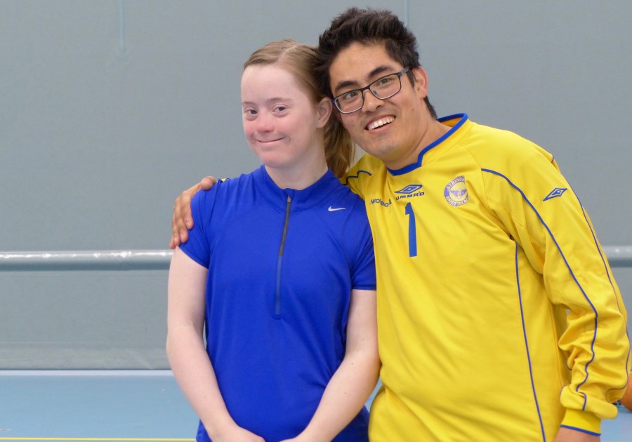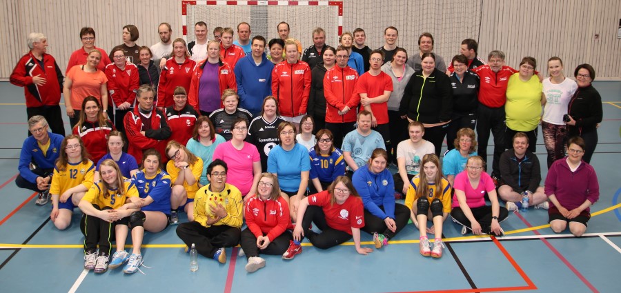 Gruppebildet fra ett av HU-arrangementene i Tromsø. BUL-spillerne i blå drakter og Bravo Funkis i hvitt og rødt: