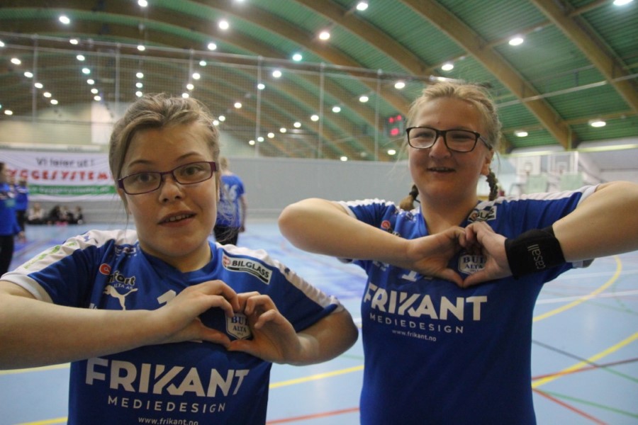 Siren Fredheim Bekkstrand (t.v.) og Lovise Nuth Pedersen viser hvor kjekt det er å spille håndball i BUL-drakt. (FOTO: Guro Kemping)