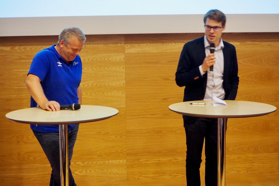 God stemning da Øyvind Togstad (t.v.) og Per Olav Hopsø fortalte om arbeidet med og ambisjonene for håndball-EM i Trondheim i 2020.