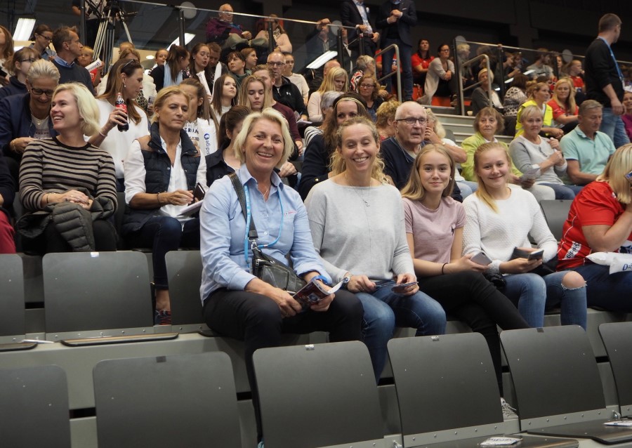 På VIP-delen av tribunen var hundrevis av landskamper representert. Foran Marit Breivik og Ann-Cathrin Eriksen. Vi ser, bak og til høyre, også Annette Skotvoll, Hege Frøseth Bjørnebye, Sissel Buchholdt og Anne Berg - og sannelig tror jeg at jeg ser litt av Elisabeth Hilmo også...