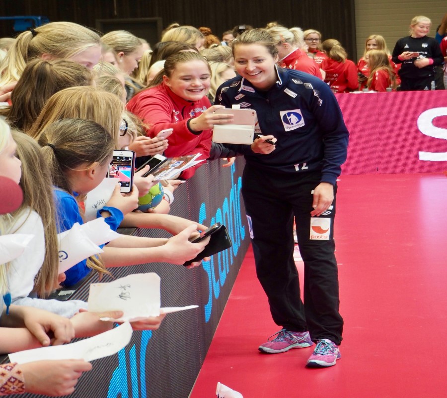 Det gjorde alle de blide guttene og jentene. Alle fikk sitt; selfies, navnertrekk på drakter og baller og ”gammeldagse” autografer på program og annet papir.