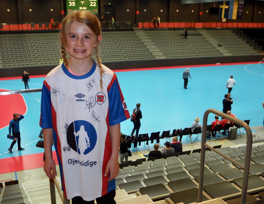 Jeg tipper Emilie på Stjørdals-Blink jenter 08-lag var én av dem som gikk aller mest fornøyd fra hallen i går. Emilie skaffet seg autografer fra mange av Håndballjentene - på landslagsdrakt, naturligvis...