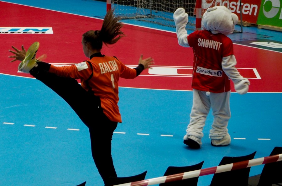 Maskot Snøhvit var ikke synderlig interessert i, eller imponert over, pause-oppvarmingen til Ukraina-målvakt Judit Balog...