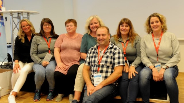 Sonelederne utgjør et veldig viktig ledd mellom klubber og regionledelse. Her er sonelederne som var med på Hell-møtet (Magnar Klingenberg var dratt da bildet ble tatt). F.v.: Nina Tranås Hansen, Marit Hegseth, Astrid Rotmo, Inger Lise G. Augdal, Beate Bårdvik, Berit Kvåle og foran damene - Bård Svendsen.