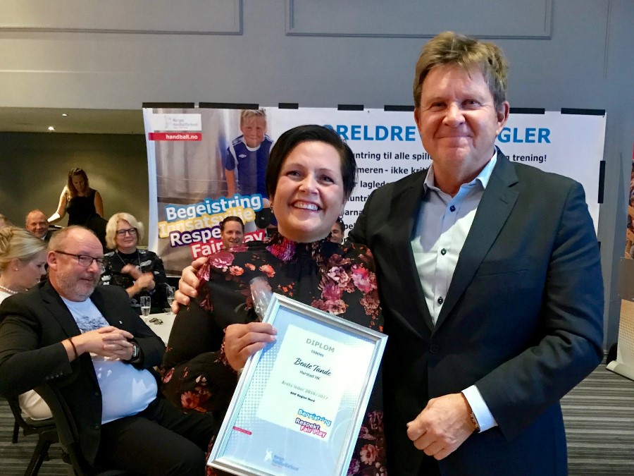 Beate Tande fra Harstad HK tok imot Årets Leder-prisen av håndballpresidenten.