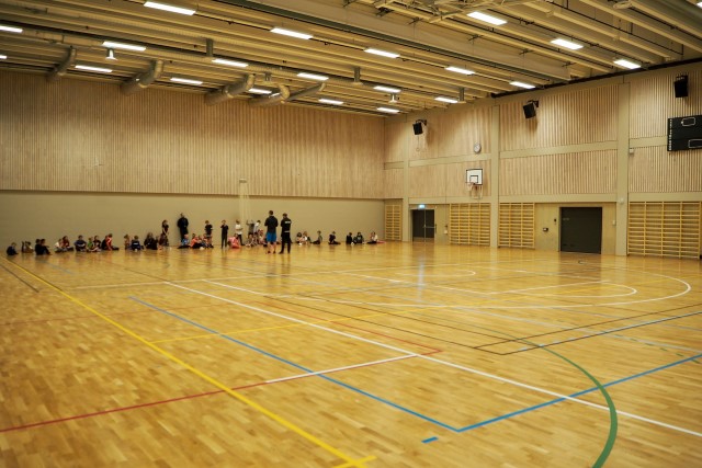 Hallen kan deles i tre enheter (på tvers). Med hele hallen i bruk, kan man også senke ned kurver som er «lagret» opp mot taket og som gjør det til en fin basketarena.