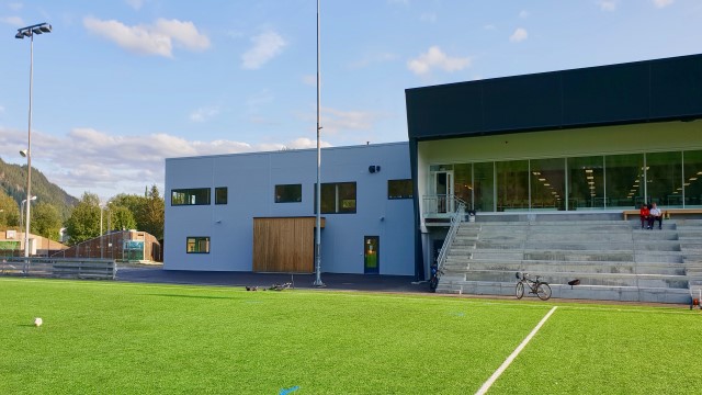 Hallen grenser mot fotballanlegg og har fastbygd tribune mot fotballanlegget.