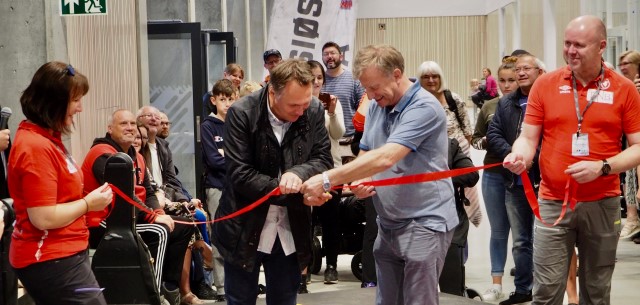 Fra den offisielle åpningen av Kolstad Arena. Fylkesordfører Tore O. Sandvik klippet snoren med assistanse av Kolstad Håndballs styreleder, Eivind Johnsen.