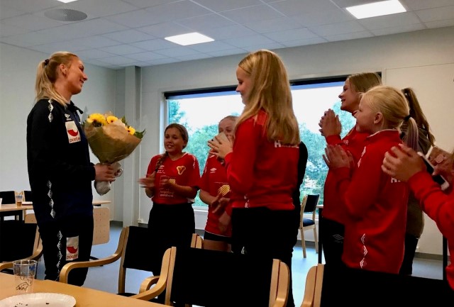 Det var spennende å få hente Emilie på flyplassen og veldig stort å få dele opplevelsen med hele laget sitt. Det var utrolig stas å bli trent og få tips og råd på banen av en av Norges beste spillere. Det overgikk nok det meste av forventningene til alle de lærevillige og spente jentene.