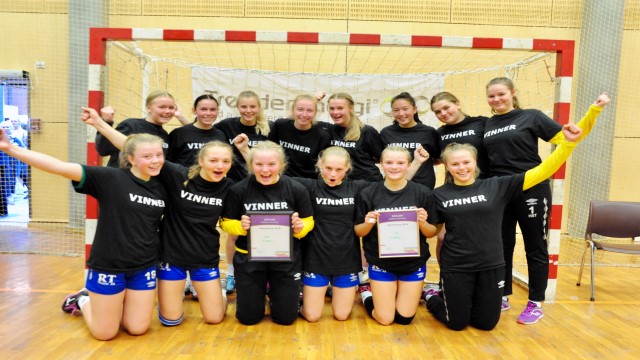 Vinnerlaget – foran f.v.:Thea Emilie Nielsen, Marthe Løseth, Vilde Eide, Aurora Flatjord, Marthe Morken og Silje Burø. Bak f.v.: Kristina Hagnes, Tale Johnsen, Thea Paulsen, Malene Sommervold, Julie Fjerstad, Kjersti Okstad, Maja Bonesrønning og Helle Tellugen. (FOTO: Tore Sæther)