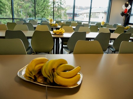 Kaffe og kake og frukt-servering i nye fine omgivelser i sosial-området mellom håndball- og fotballhallen.