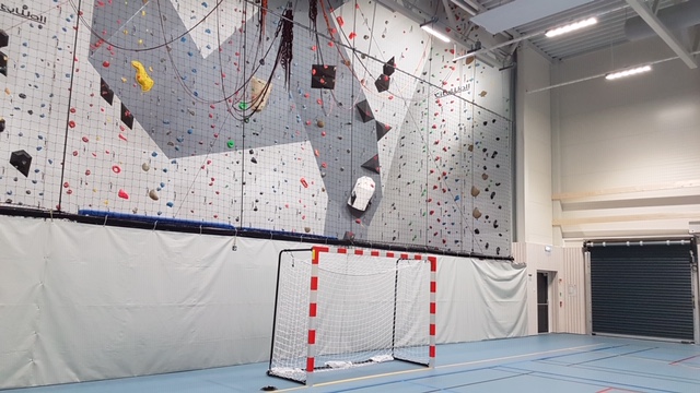 Klubbrom, sosialrom, hoppegrop (turn), klatrehall og buldrerom.