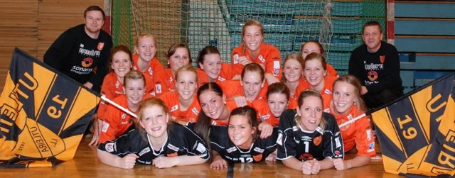 Fornøyde Utleira-jenter sammen med trenerduoen Willy (t.h.) og Robert Harper. (FOTO: Privat)