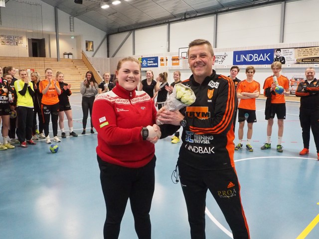Glade spillere og applaus da Willy fikk servert blomster av Håndballregionens Monica Ibsen og nyheten om kåringen til Månedens Forbilde. (FOTO: Tore Sæther)
