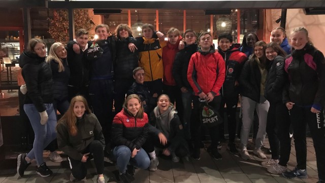 Vi inviterte de tilreisende spillerne på pizza på Egon under bylagssamlingen, og alle ble mette og strålende fornøyd. Foto: Monica Ibsen
