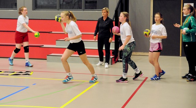 Fra dagens trening: Skuddtrening er moro. Her er det kantskudd som trenes med trener Camilla som "overvåker" og instruerer... (FOTO: Tore Sæther)