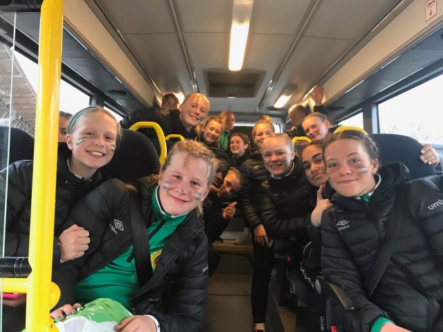 God stemning i bussen. Heimdal-jentene på vei til Baldus cup sist helg. (FOTO: Privat)
