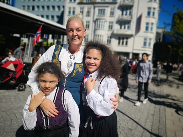 Heller ikke 17.mai er «klemme-fri». Søstrene Adelene (t.v.) og Deziré møtte trener Camilla på nasjonaldagen. (Foto: PRIVAT)