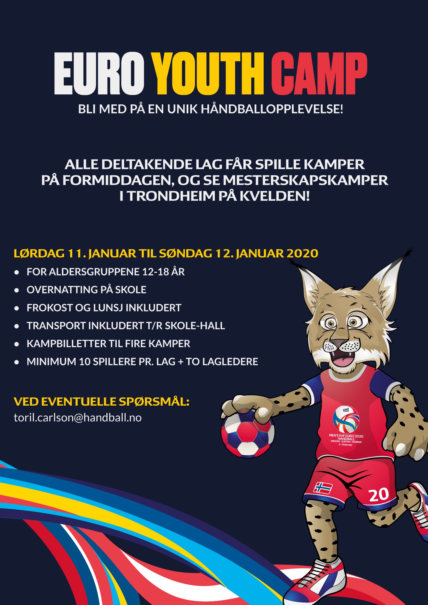 I forbindelse med EURO 2020 i Trondheim arrangerer NHF Region Nord EURO Youth Camp 11.-12. januar 2020, for håndballag i aldersgruppene 12-18 år.