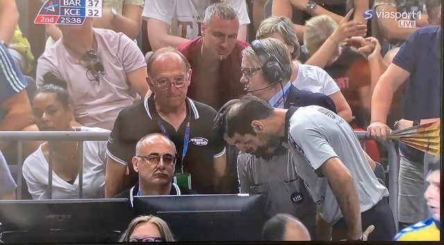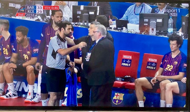 Kok ved Barcelona-benken i bronsefinalen. Dommer og Barca-sjef Fuertes er absolutt ikke enig. Togstad må rydde opp.