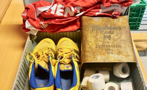 Kofferten med bjella, og taperullene, supporterdrakten og de gule håndballskoene...