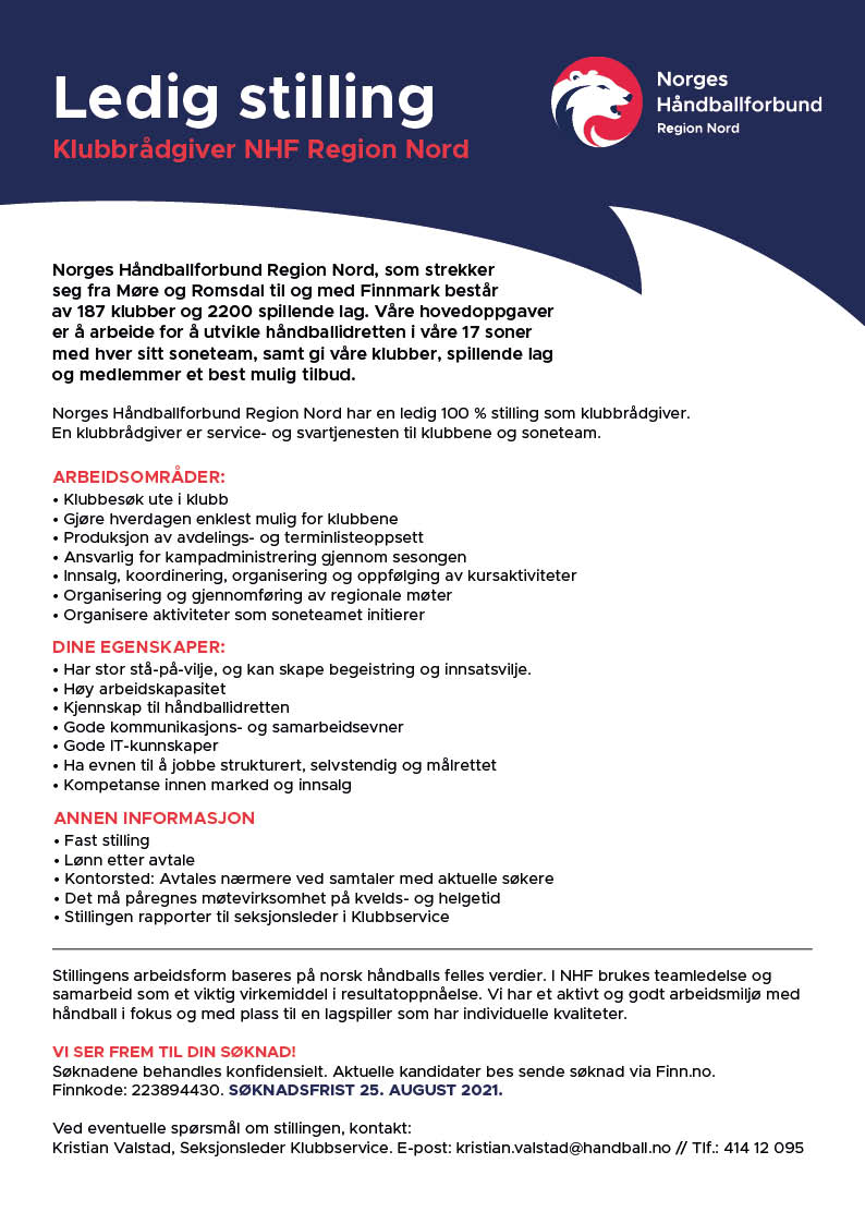 Er du vår nye klubbrådgiver? Vil du være med på å skape begeistring rundt håndballen? Søk på stillingen innen 25. august. Monica Ibsen 03.08.21 kl. 14:36 Denne saken er eldre enn ett år, og kan inneholde utdatert informasjon.