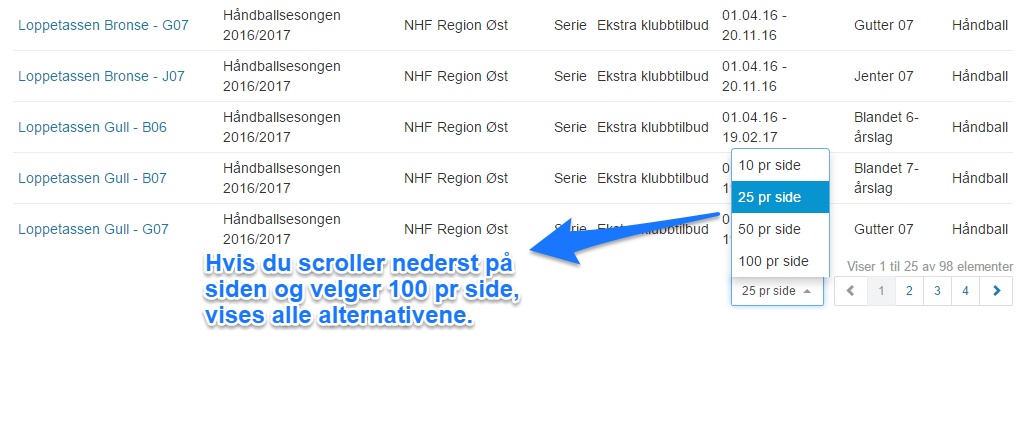 - Ønsker man å se over påmeldingene kan man fra forsiden velge «Påmeldte lag». Her kan man i perioden turneringen er åpen for påmelding endre sine påmeldinger.