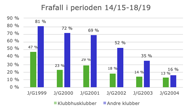 Klubber som har gjennomført 1 eller flere moduler i sesong 16/17 og 17/18 satt opp mot klubbene som ikke er med. Viser klar forskjell mellom klubbhusklubber og ”de andre”. Frafall summert fra start til 01.03.19.