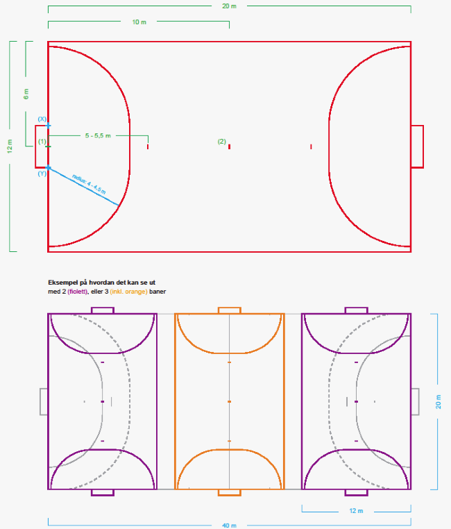 Det skal benyttes minibane, altså 20x12 m og målfeltlinja skal være 4,5 m. Altså i tråd med eksisterende mål i minihåndball.