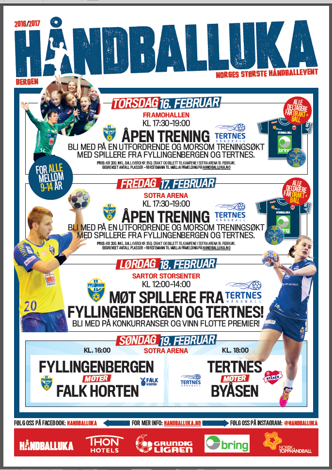 Arrangementet er en del av Handballuka og det vil i forkant av kampene være forskjellige arrangement hvor det er mulig å både trene med og møte spillerne fra både FyllingenBergen og Tertnes Elite. Se plakat under eller www.handballuka.no for mer informajon.