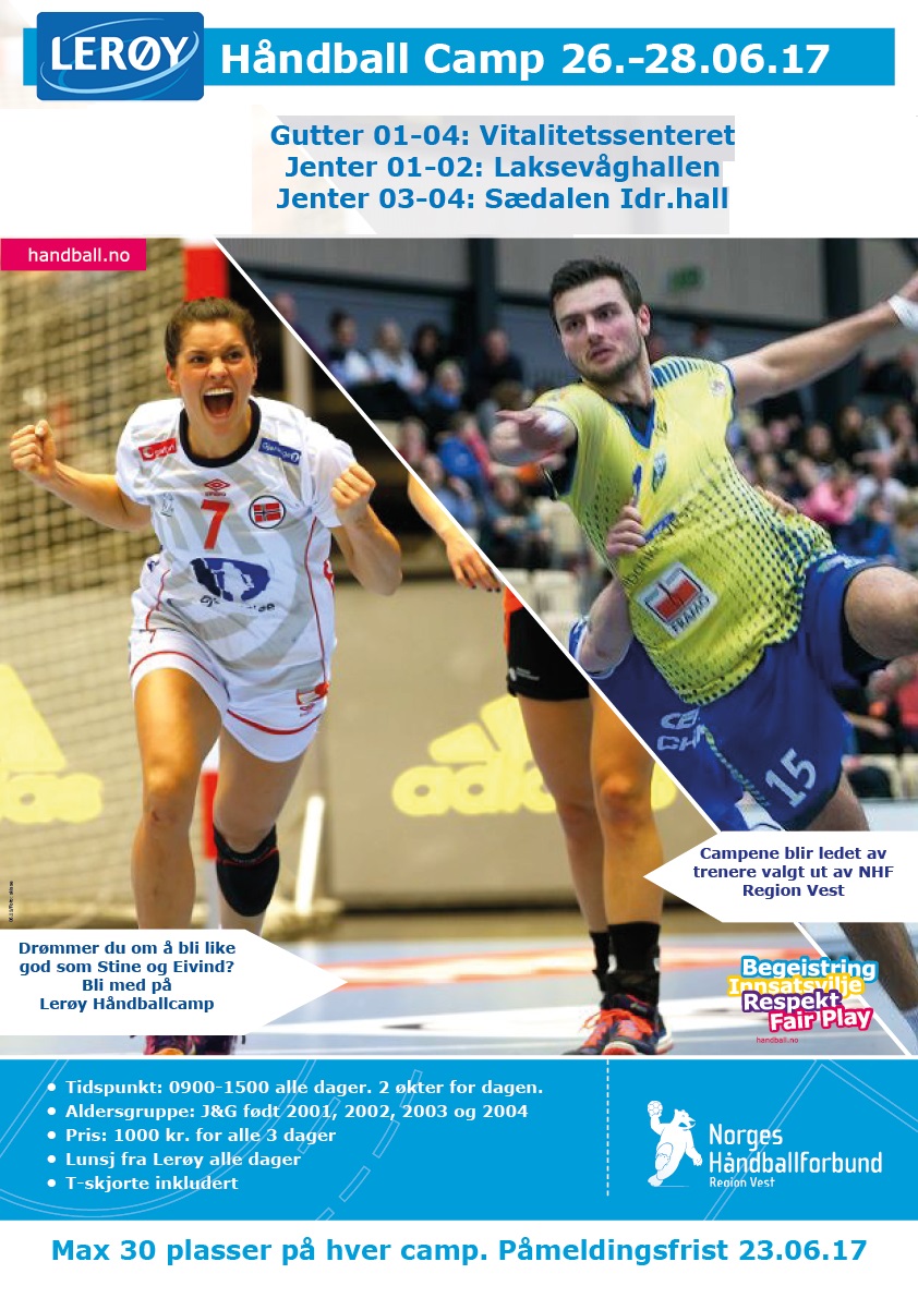 I samarbeid med Lerøy inviterer NHF Region Vest gutter og jenter født 2001, 2002, 2003 og 2004 til Lerøy-håndballcamp i sommerferien! Det blir håndballcamper både i Sogn og Fjordane og i Bergen.