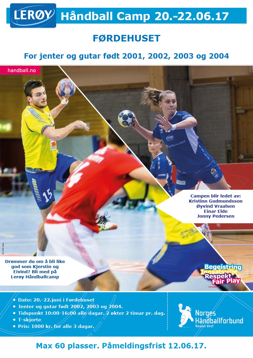 Påmelding gjøres her. Påmeldingsfrist for Lerøy Håndballcamp i Sogn og Fjordane er 12. juni. Det vil maksimalt være plass til 60 utøvere på denne Håndballcampen.