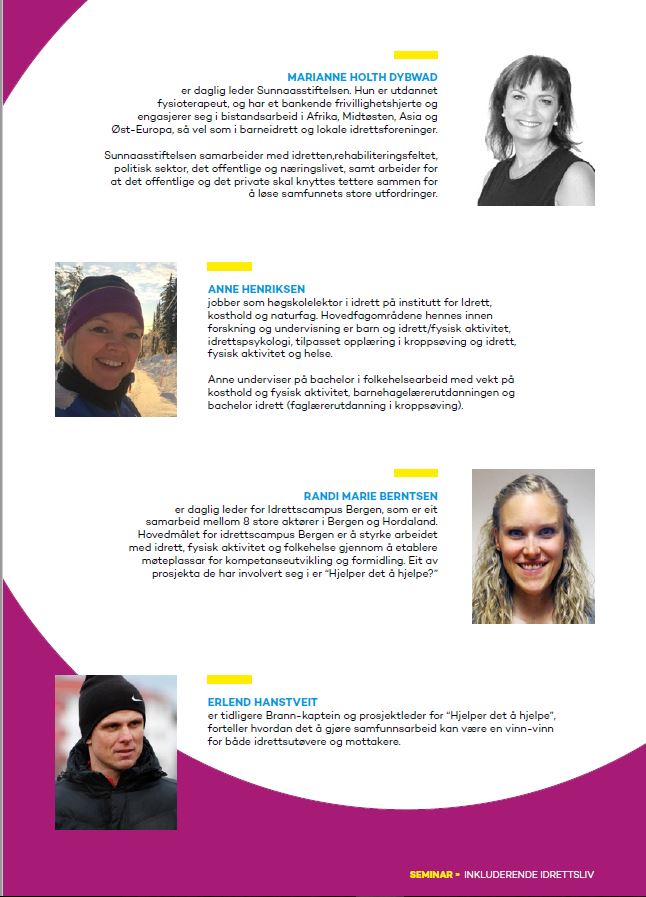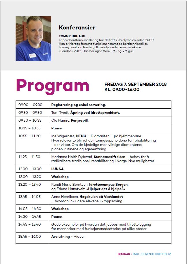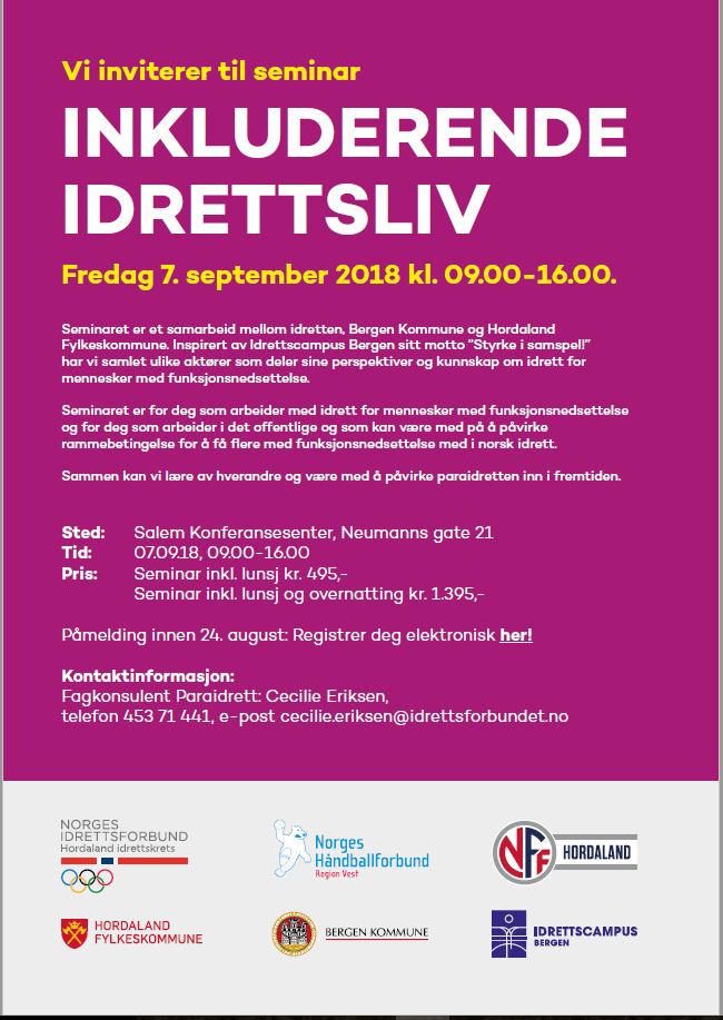 Inkluderende idrettsliv I forbindelse med landsturneringen inviterer vi til seminar; Inkluderende arbeidsliv, fredag 7.september. Christine Ullestad 09.05.18 kl. 13:34 Denne saken er eldre enn ett år, og kan inneholde utdatert informasjon. Påmelding gjøres ved å trykke her.