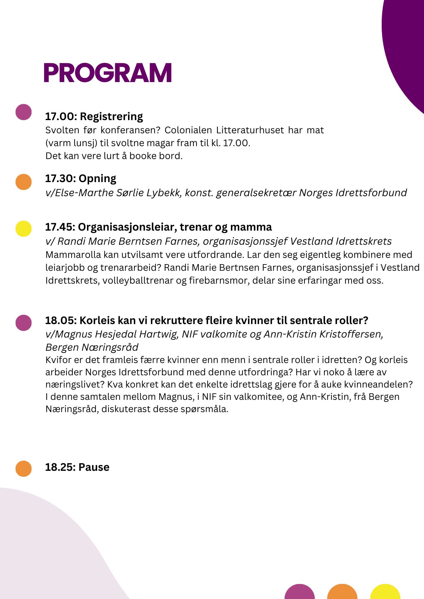 Vi tar for oss seniorenspilleren. Sammen med våre dyktige foredragsholdere tar vi opp temaer som graviditet, i hvilken grad idretten lar seg kombinere med mammarollen, og hvordan vi kan få flere kvinner inn i sentrale roller i idretten.