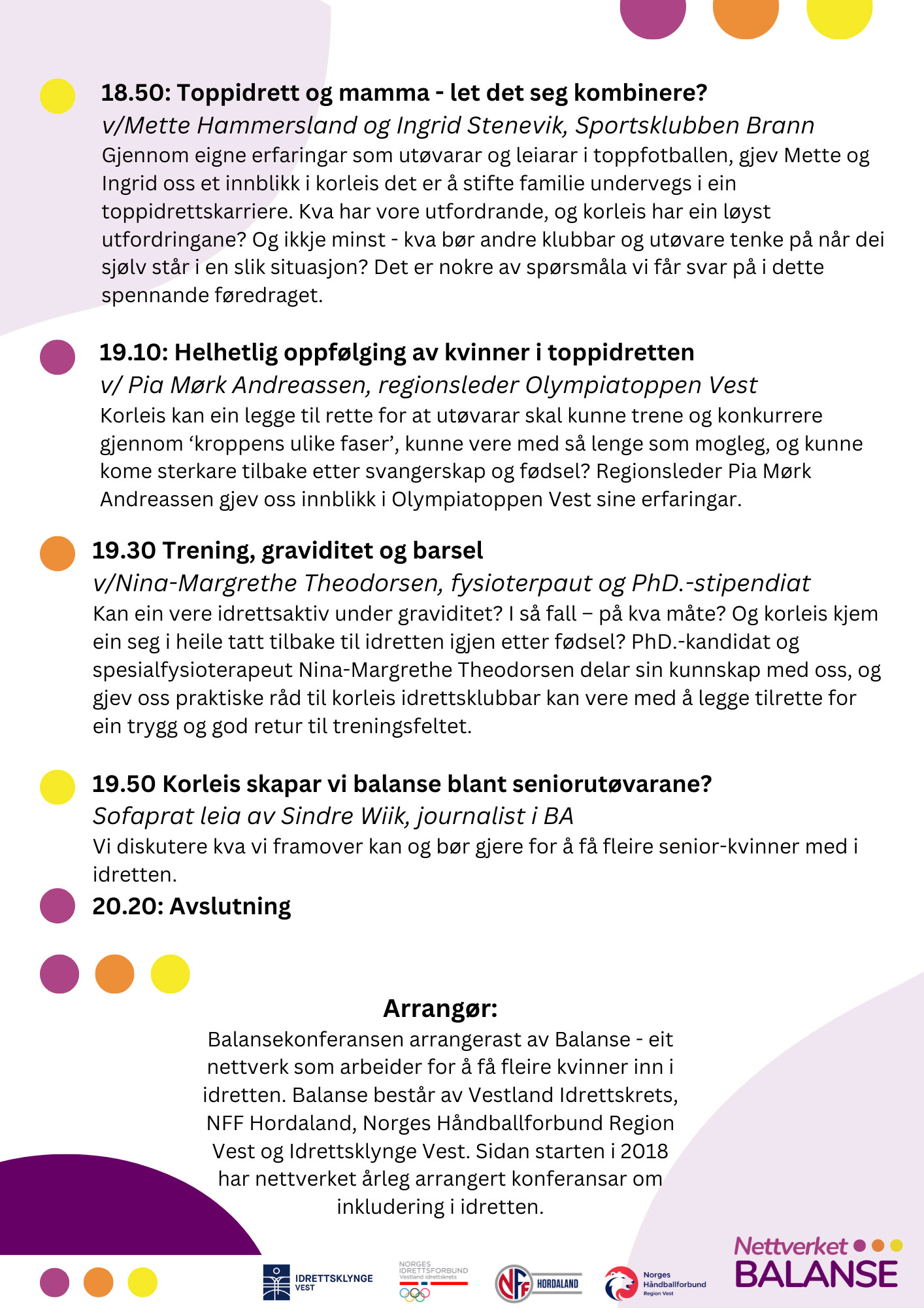 Nettverket Balanse inviterer derfor deg som er trener, leder, eller som bare er veldig interessert i idrett, til en foredragsrekke om kvinner i idretten. Denne gangen er fokuset på senioren. Sammen med våre dyktige foredragsholdere tar vi opp temaer som graviditet, i hvilken grad idretten lar seg kombinere med mammarollen, og hvordan vi kan få flere kvinner inn i sentrale roller i idretten.