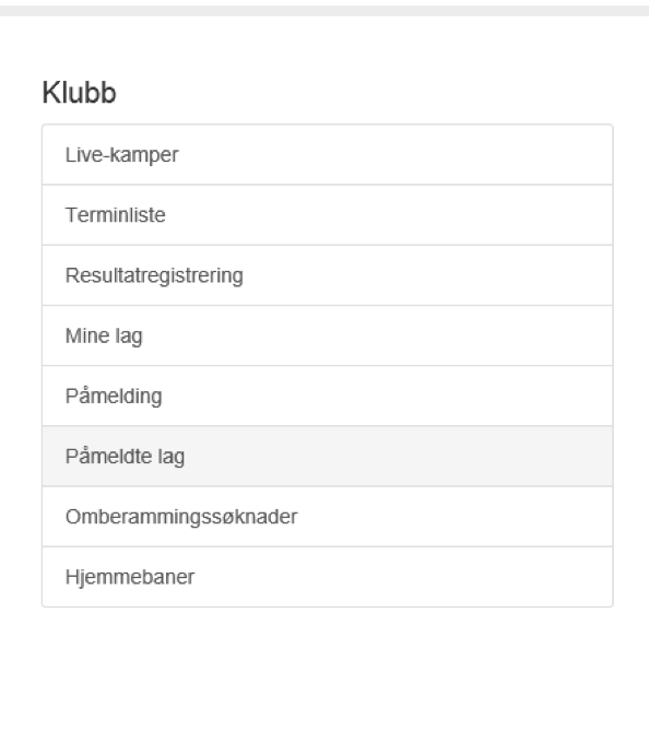 - Ønsker man å se over påmeldingene kan man fra forsiden velge «Påmeldte lag». Her kan man i perioden turneringen er åpen for påmelding endre sine påmeldinger.